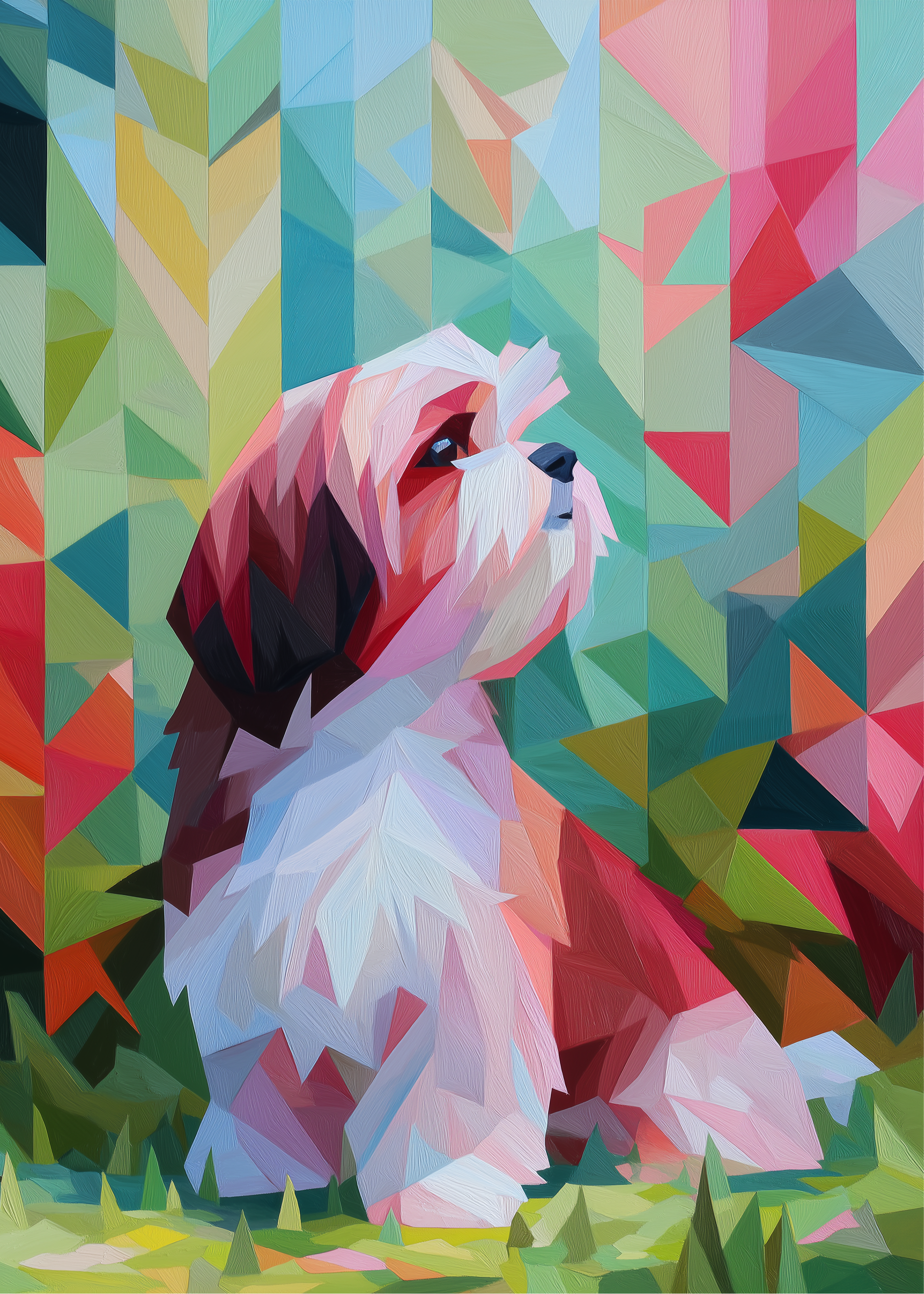 The Shih Tzu’s calm nobility and affectionate spirit are perfectly framed in this royal yet relaxed portrait. Their gentle nature and watchful gaze shine through. A symphony of soft pastels and jewel tones reveals the Shih Tzu’s quiet regality.